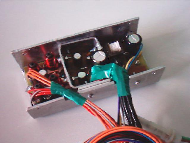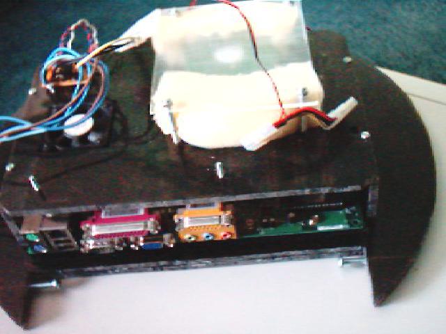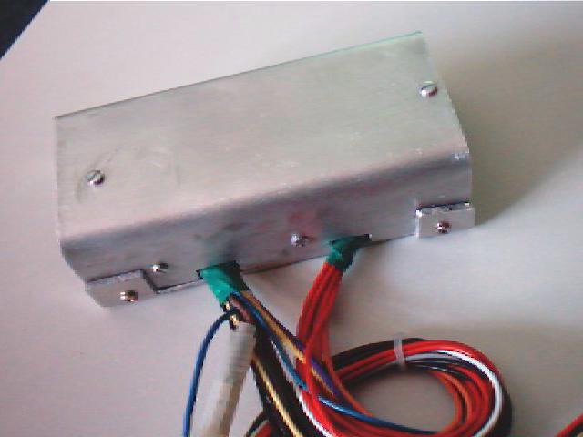 The 12V to ATX power supply is now complete and tested. The board layout is available here (eps), which implements the schematic found at the above link (which themselves came from datasheets) and also includes a full ATX style ON/OFF from this(eps) schematic. In making the board I spotted some problems with this layout. The ground wires are too hard to get to, the -5V bits should have been moved further right to make more room. Forget the Power Good signal, turns out there was enough room on the bottom left of the board to add the capacitor and resister that the reference used. Would have be better to use the bottom right. While the power supply is on, powering the Celeron 400, the 5V regulator gets really hot and needs a large heatsink. By itself it is too hot to touch in 20 seconds. For the Celeron 400, all other parts ran cool - even the 3.3V regulator. Suggests there is a cut off point above which the regs will need a good heatsink - even though the worst case showed the 3.3/5V regs would give off around 7 W each. So, the layout of the regs I used isn't the most ideal for easy heatsinking. The heavy diodes all ran cold and so are fine as they are. In the BIOS the whole system was drawing 2.5A from the 12V supply. Testing on the Cyrix 3 533, running at 266 Mhz, the 5V reg didn't get quite as hot, and the 3.3V reg was hotter than before. At around 2A on the 12V supply this generally drew less current so it was to be expected. Putting the system into sleep mode it draws 1A, but as the CPU fan was still running, I suspect it can go lower. In the end, this heat didn't really matter as the PSU case was then made of 1/8" aluminium plate, folded to cover three sides and then another peice covering the fourth large side. As the pictures below show: